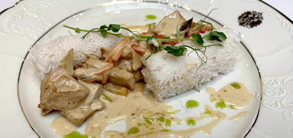 Main course: Vegan curry in coconut sauce with crispy vegetables and basmati rice