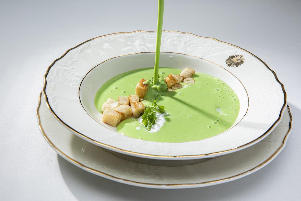 Soup: Cream of sweet peas with chive yogurt and croutons