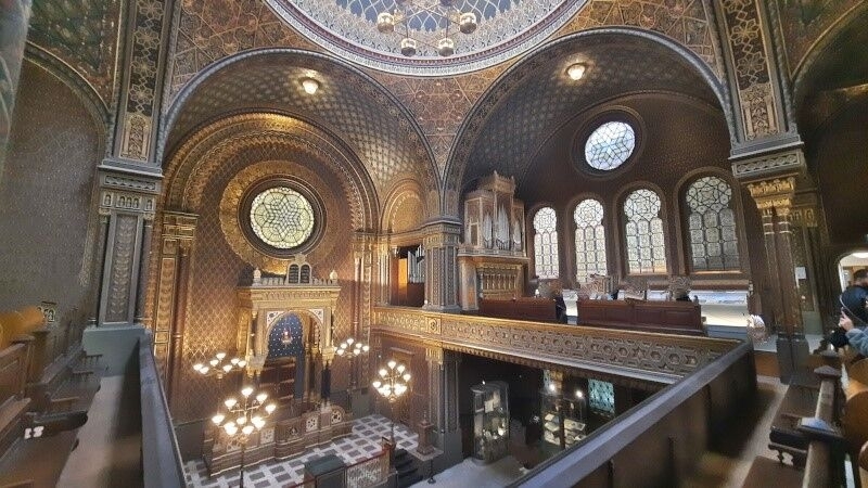 Probably the oldest synagogue in Prague, known as the Old School (Altschul), used to stand on the site of the current synagogue. Because in the second half of the 19th century its capacity was no longer sufficient for the needs of the reformist Jewish community that used it, it was demolished in 1867 and replaced a year later by the Spanish Synagogue, which probably owes its name to the Moorish style in which it is built. This style was used in the Middle Ages in Spain. However, this designation is rather newer, in older sources it is commonly referred to as "Geistgasse-Tempel", or "Temple in Dušní Street". The plans were drawn up by architects Vojtěch Ignác Ullmann and Josef Niklas (interiors). The construction itself was entrusted to the builder Jan Bělský.